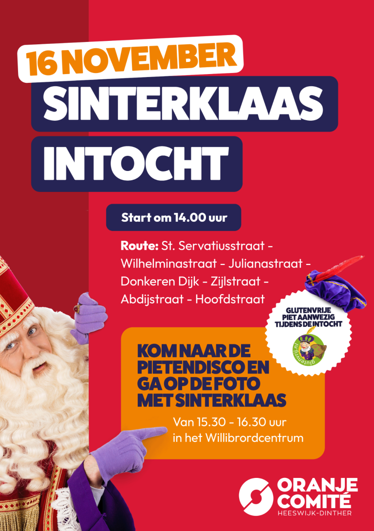 Sinterklaas en zijn Pieten starten bij de Dintherse Kerk en trekken in een vrolijke optocht door het dorp richting de kerk van Heeswijk. Onderweg wordt er gezwaaid, gezongen en uitbundig pepernoten gestrooid – een feest voor jong en oud!
